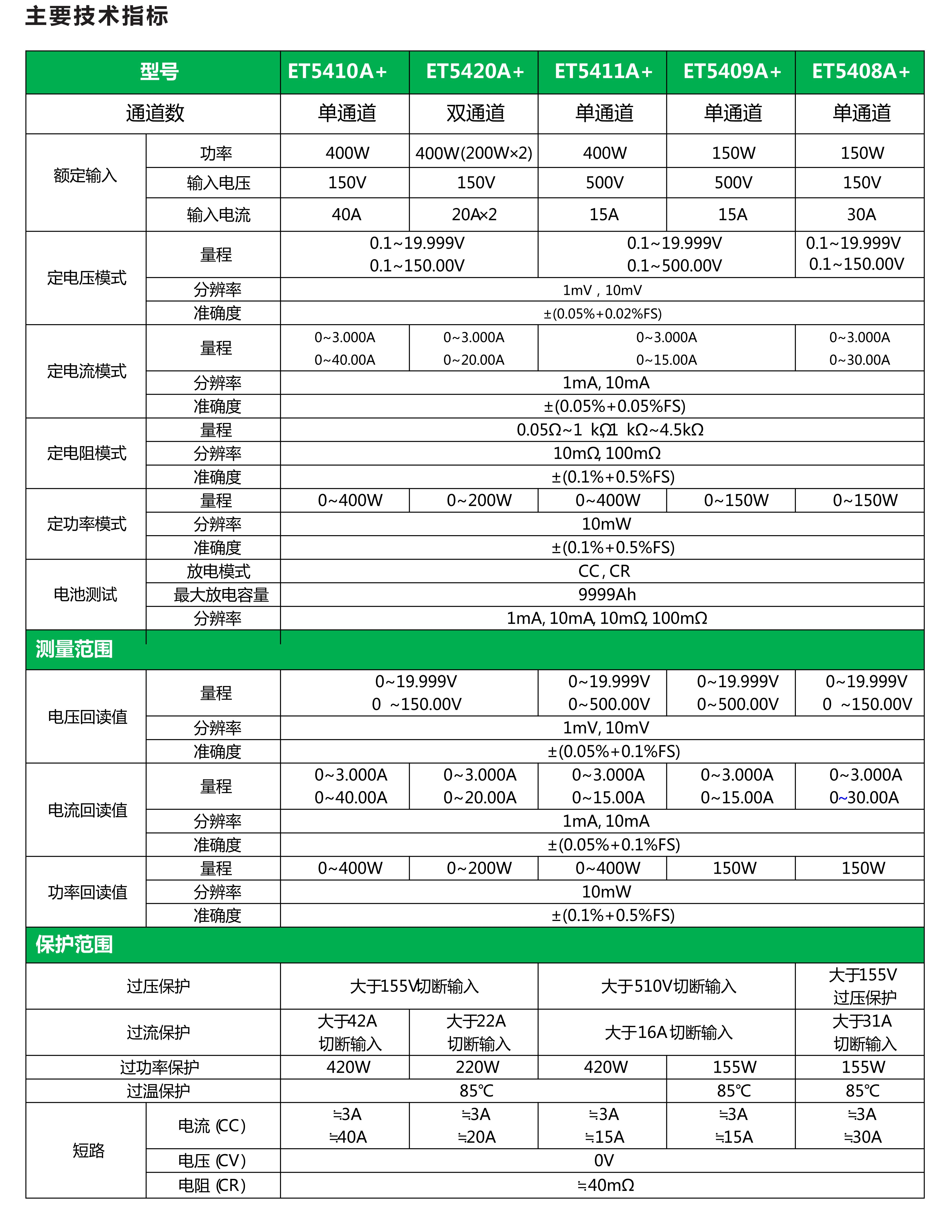 ET5400A+  系列为单通道/双通道的可编程直流电子负载,在原有老款机型ET5400 系列的基础上优化了操作使用 方式和增加增强了各种专业性功能,采用高性能芯片,高速,高精度设计,提供最高1mV、1mA   的解析度,性能优 越,可广泛运用于充电器,开关电源,线性电源,各类电池等行业的生产线测试,科研机构等试验研发领域。